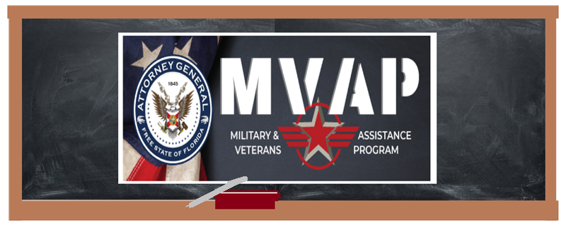 The Military and Veterans Assistance Program (“MVAP”) was created by the Florida Attorney General’s Office to help educate military members and veterans on the types of scams that target their communities, what they can do to protect themselves, and how they can help protect others by reporting scams and deceptive business practices. In addition, members of the MVAP team work directly with military servicemembers and veterans who have been targeted, or their representatives, to help resolve their consumer protection related issues or find other outside assistance if necessary.